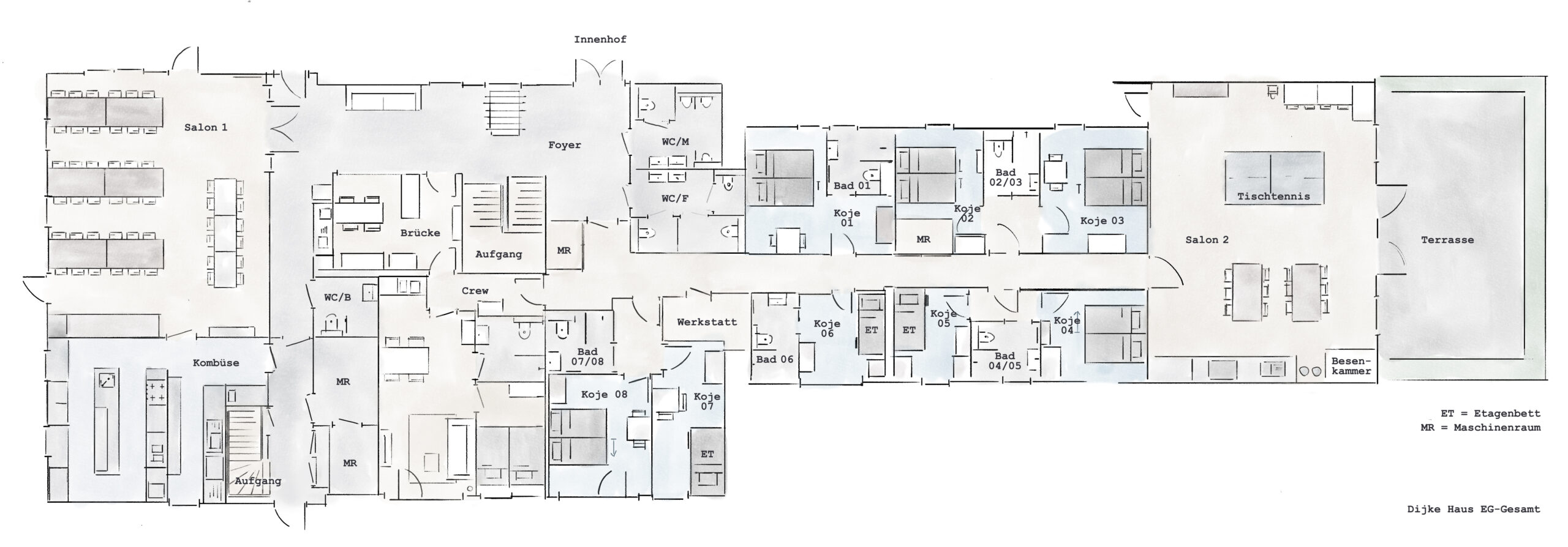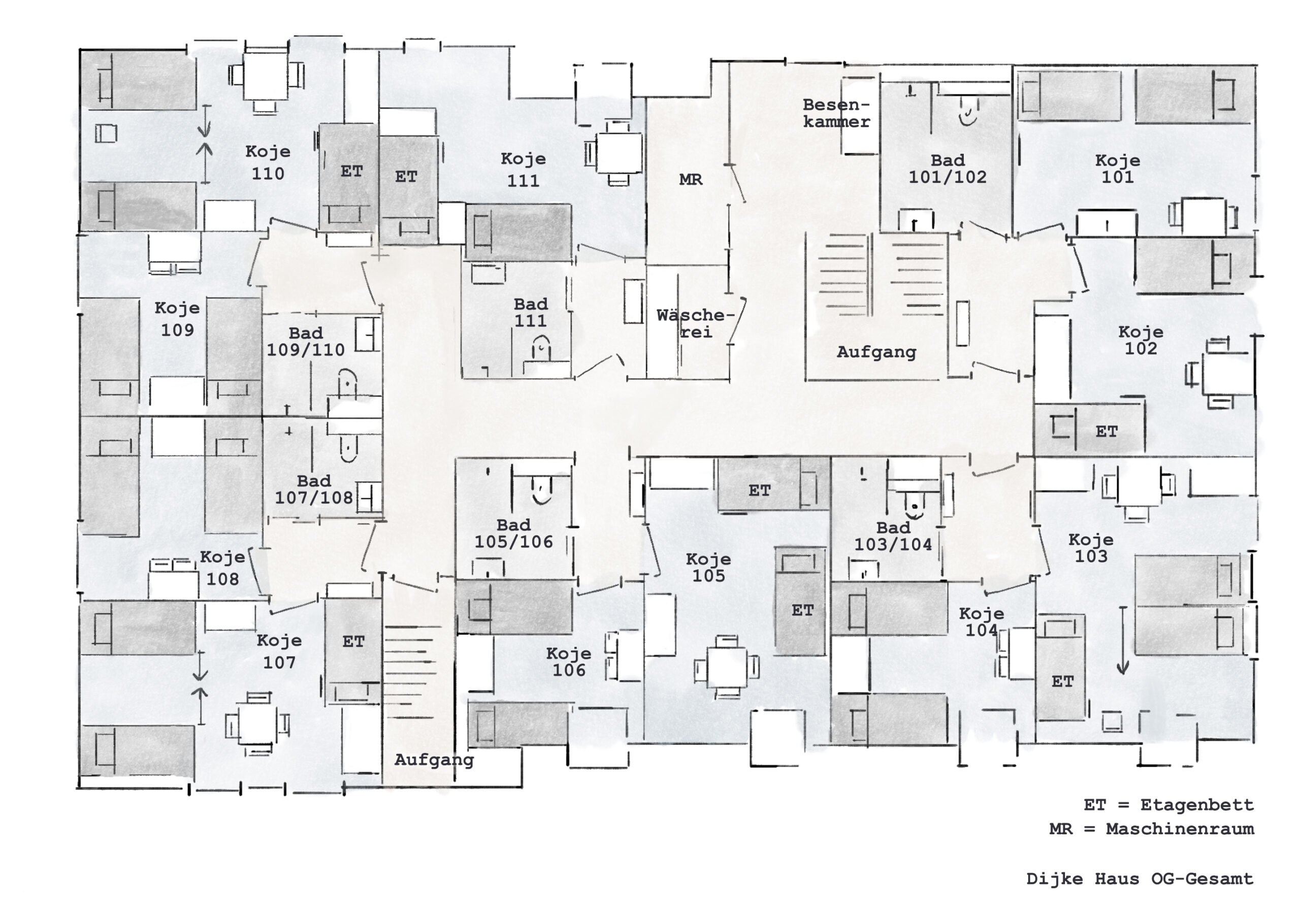 - im Detail: Das OG bietet 11 Kojen mit 32 Betten und das EG hat 8 Kojen mit 16 Betten